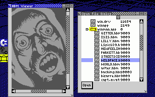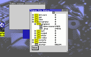 ![]() Sometimes a folder will be nested too deep and you may want to simply go into one of the folders so that the tree is smaller and there aren't as many levels showing. Simply select a folder, and click open. The tree is then replaced by a new tree starting only at the folder you've just opened. To move back up a directory select the pulldown menu from the top. It contains a list of all the parent folders above the folder that the top of the tree is in. This not only allows you to go back to any one of the parent folders with just ![]() When you find the file you want in the file system, select it and click open. The file will then open in the program. As you can see in the second screen shot, I've selected the filename "wildface.hbm," clicked open, and it is now displaying in the display window. The open file dialog box is, of course, a moveable and resizeable window. So if you want to see more files at a time, just drag the window a little larger. The open dialog box of one program also doesn't commandeer the rest of the system. You can leave an open dialog box on the screen and click over to another program like AJirc, and then come back to it later.
